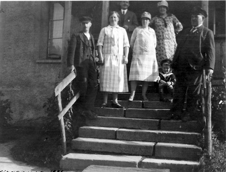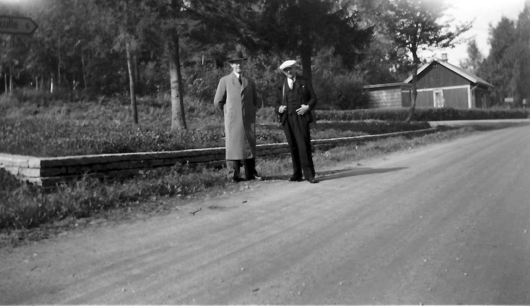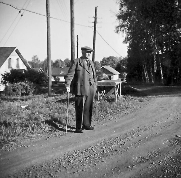 Bild 2915 Kinnekulle Fullösa socken Gössäter Gustav Johansson från Nysäter i väntan på att få börja arbeta på Karlslunds Pensionat. Till höger syns nedre delen av ”Lönnalia” och i bakgrunden skymtar Kullebosvängen. Vägen till vänster leder fram till Gössäters station. Bilden tagen på 1950-talet