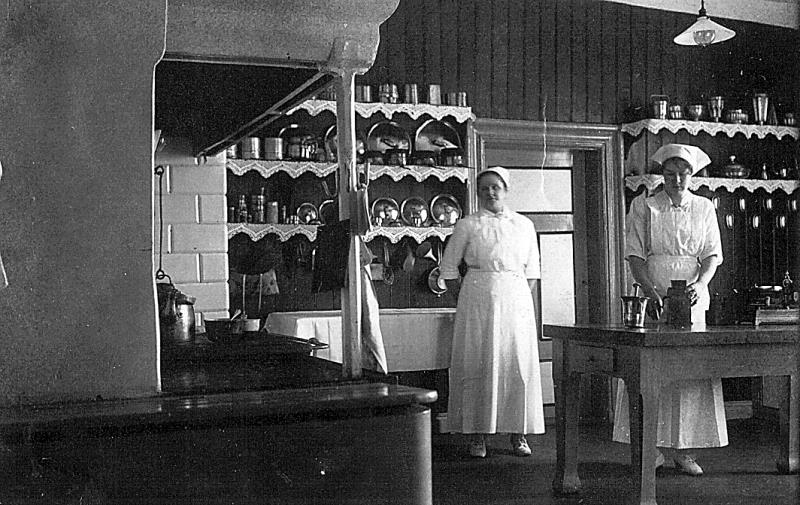 Bild 1751 Köket Råbäck, Kokerskan Mia och vid bordet Nanny Svensson, foto: omkring 1920