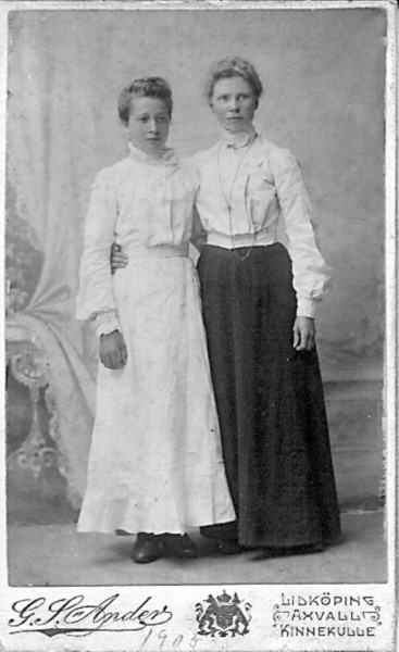 Bild 3462 Kinnekulle Västerplana socken Anna Svensson och Ester Franson i Beet Västerplana (Övfre Nolgården Eksberg) hon var född 1889, hennes syskon hette: Axel Henning född 1886, Wendela Maria född 1883, Frans Wilhelm född 1878, Karl Oskar född 1876. Mor Emma Kristina född 186 död 1922 gick under namnet Emma i Beét. Foto GS. [...]