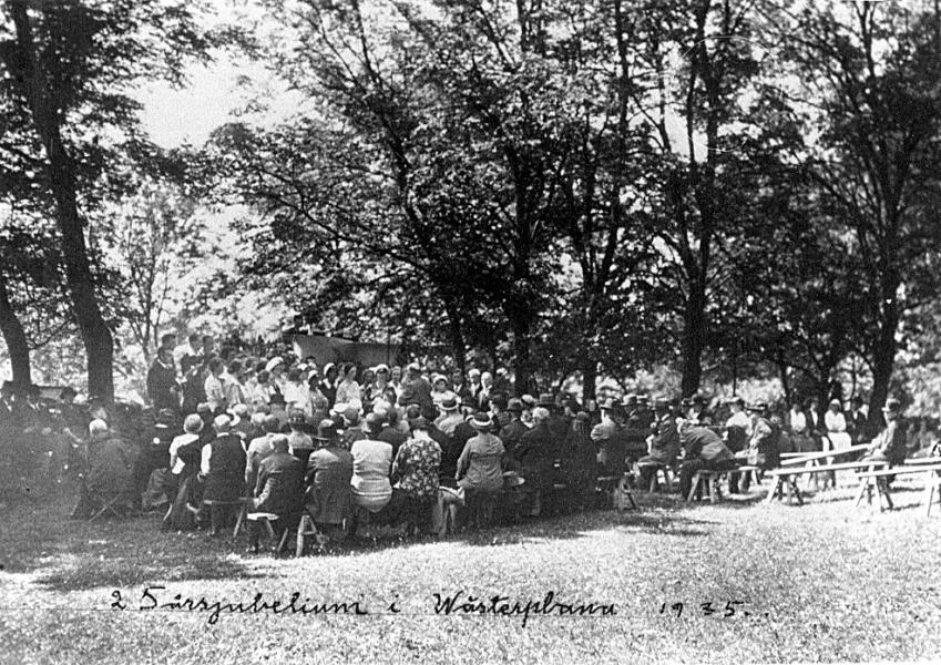 År 1935. Midsommarmöte i trädgårdshagen på Storegården. Missionsförbundet hade möten fram till 1950-talet
